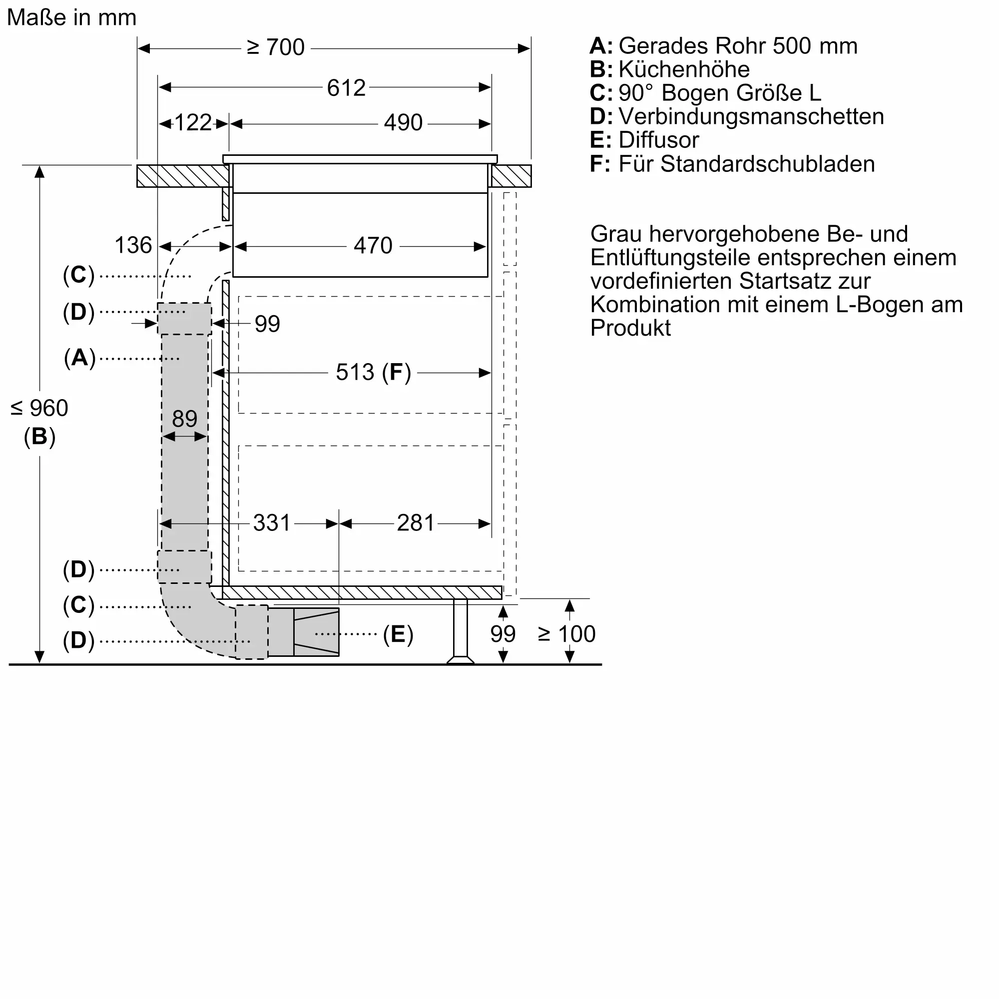 Zubehörset für teilgeführte Umluft Ihres Kochfeldes mit integriertem Lüftungsmodul. Es ist zu verwenden in Kombination mit dem bereits im Geräteset enthaltenen Flachkanalbogen.